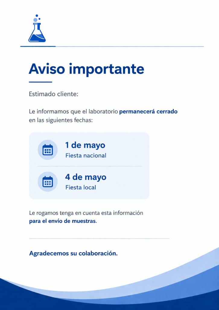 Le informamos que el laboratorio permanecerá cerrado 01/05/2026 ( Fiesta nacional ) y 04/05/2026 ( Fiesta local )